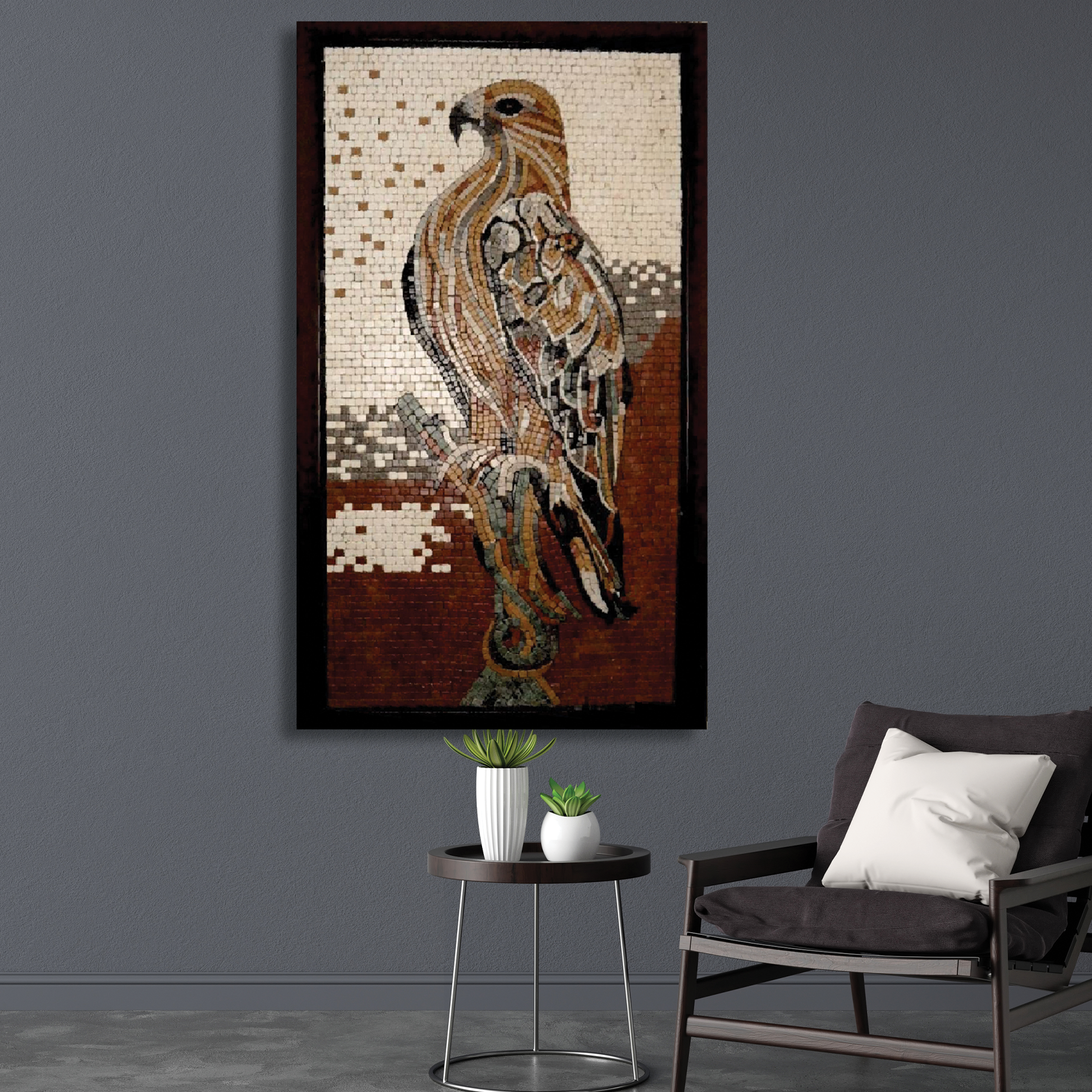 Elevate your environment with the Majestic Eagle Mosaic Wall Art, a masterful creation showcasing an eagle crafted from precision-cut stones. This handcrafted piece embodies freedom, vision, and strength through meticulous placement by skilled artisans. Its intricate detail and timeless design make it a distinguished addition to any space, reflecting both artistic excellence and symbolic power.