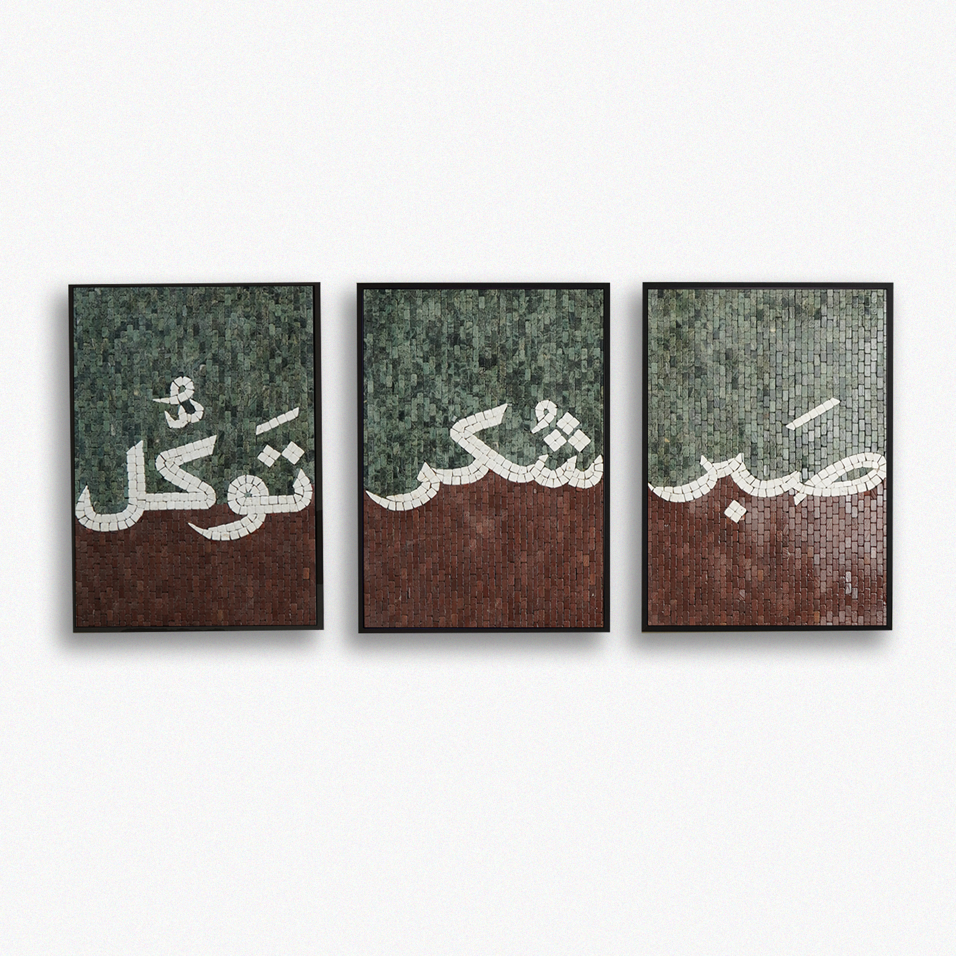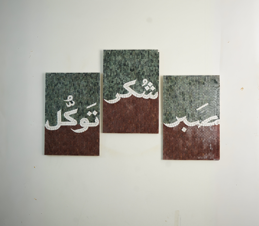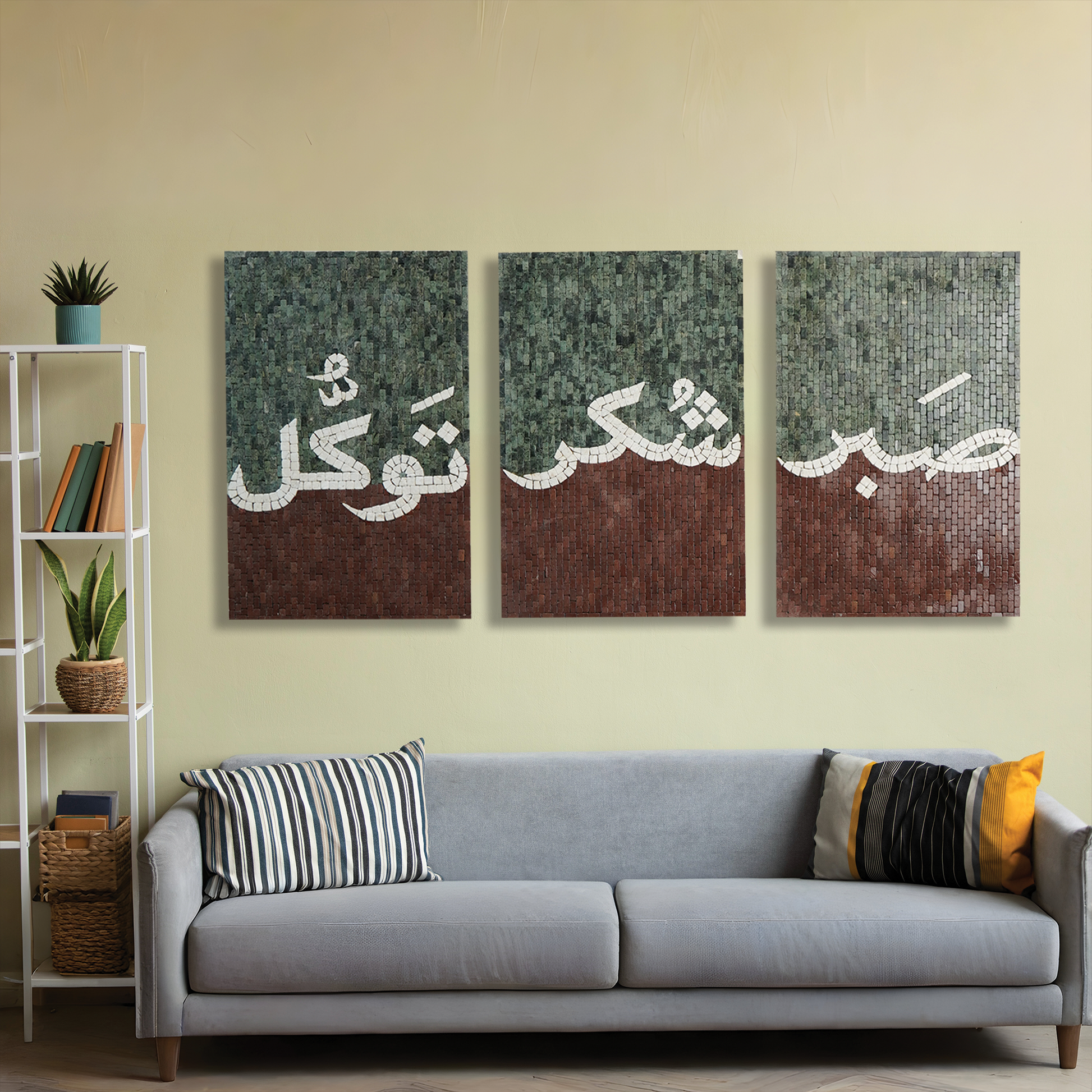 Elevate your space with the Sabar Shukar Tawakal Calligraphy Art—a handcrafted mosaic that blends spiritual depth with artistic elegance. Featuring detailed stone and marble calligraphy, this unique piece symbolizes patience, gratitude, and trust. Its neutral tones suit any décor, while the ready-to-hang design ensures easy installation. A perfect gift or addition to your home, office, or prayer space, bringing timeless beauty and daily inspiration.