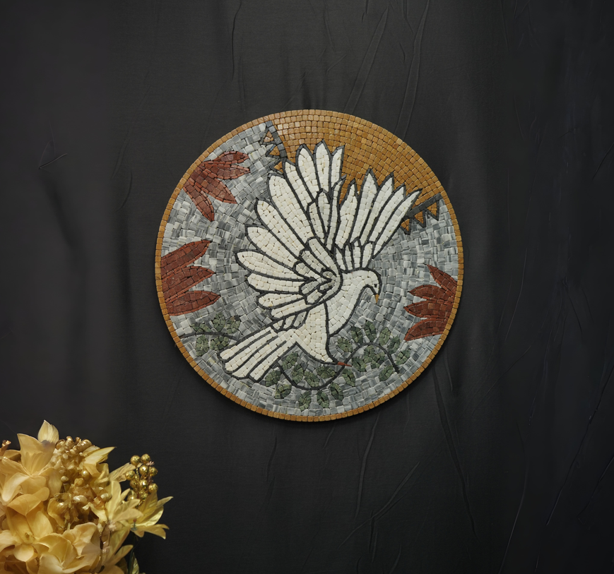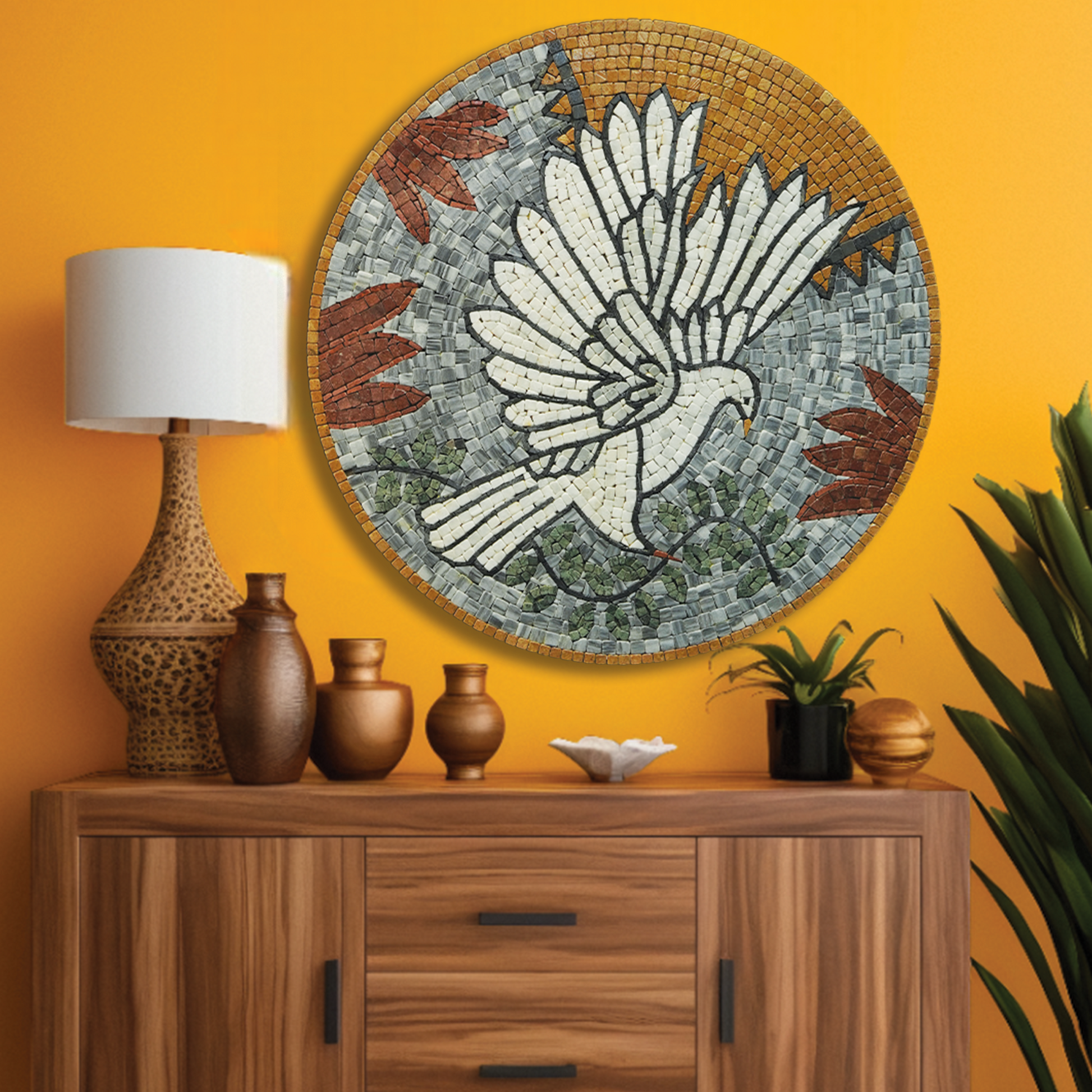 Add a touch of positivity to your home with this Handcrafted Dove Mosaic Wall Art. Featuring a detailed dove design crafted from stone and marble, this mosaic wall art brings calm and beauty to any space. Perfect for living rooms, bedrooms, or offices, it’s a unique, fade-proof décor piece that enhances any room with a sense of peace.